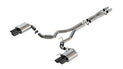 This 3" diameter True Dual Quad Tip Borla(r) Cat-Back(tm) system features a merge X-Pipe for increased performance and improved sound. Muffler contains Polyphonic Harmonizer technology which utilizes patented units that contain pipes of different diameters and lengths to create multiple exhaust notes that harmonize to deliver a clean, rich, full-bodied sound. This system features the aggressive ATAK(r) sound with no drone inside the vehicle and 4" black chrome on T-304 stainless steel tips, and is for vehicles WITHOUT the Active Exhaust feature. Using Borla(r) Stainless Steel Polish p# 21461 is NOT recommended with these black chrome tips. Systems with bright chrome on T-304 stainless steel tips, and carbon fiber tips are also available. If your car has 1 tip on each muffler and you want to upgrade it to 2 tips on each muffler (also know as quad tips), this is the system for you. It is designed to work with the quad tip (2 tips per muffler) O.E. Ford Valance ONLY. If you want to install this system on a vehicle that came with one tip per muffler you will need to buy and install a different valance. Ford quad tip valance part numbers: With Parking Sensors = PR3Z-17F828-DA, Without Parking Sensors = PR3Z-17F828-CA. Borla(r) Cat-Back(tm) and Axle-Back exhaust systems feature patented straight-through and multi-core technology designed to unleash hidden horsepower. Increased exhaust velocity adds power, driving excitement, fuel economy, and the distinctive Borla(r) Sound of Power respected by motoring enthusiasts everywhere. Each system is built from premium T-304 stainless steel, superior to T-400 series knockoffs (such as 409), to give you the absolute best in performance and durability.