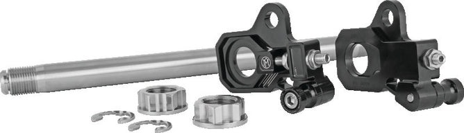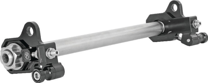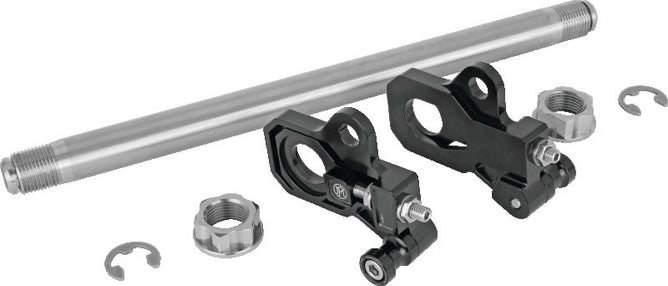 Dials in the rear wheel alignment and tunes the belt/chain tension on Harley-Davidson® Touring models. Constructed from durable stainless steel and billet aluminum with laser markings and threaded screw-style adjustment sliders. Kit includes rear axle, adjustor mounts, sliders, axle nut, safety e-clips, upper and lower shock mount bolts and spacers.