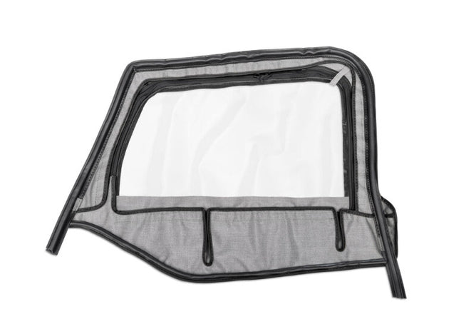 Replace your aging, worn out factory soft-top and gain some additional storage space inside the driving compartment. All the features of the original factory top with exclusive Rampage additions which includes two zippered storage pockets. Produced in original factory specifications and colors. The Rampage replacement top easily installs over factory framework, attaches to factory mounting points and original equipment belt rail attachment system. Also, with door skins that slip over the upper doorframes. Soft upper doors are included. Fits all factory applications. Available with either tinted or clear windows. For half door applications only.